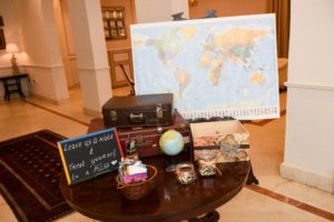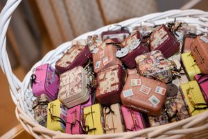 Debbie worked as a travel agent so she wanted something to represent her line of work. Therefor, the wedding favours where in a small suitcase. To top it all up the guests had a world map to fill in with all their wishes during this celebration.